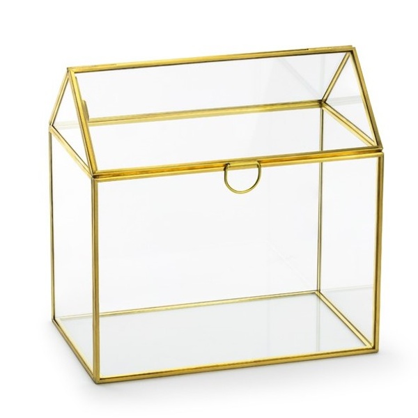Skleněná truhla na přání ve tvaru obálky se zlatým okrajem.