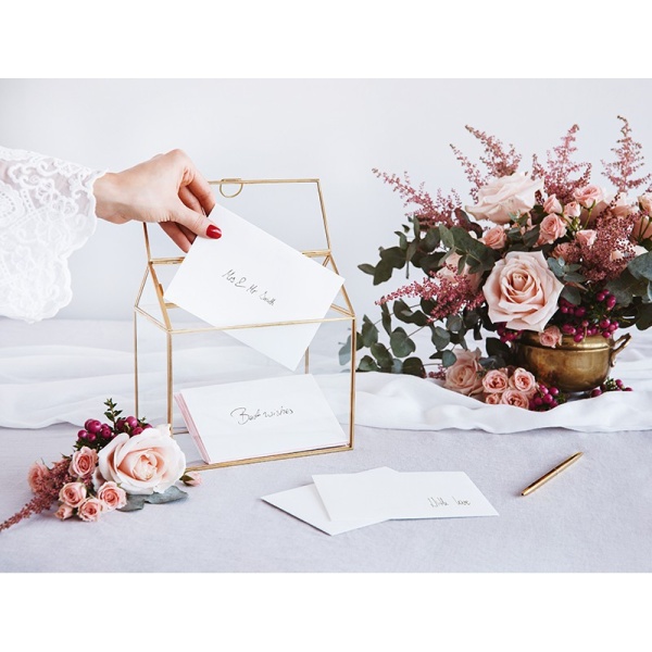| Skleněná truhla na přání ve tvaru obálky se zlatým okrajem. Elegantní truhla ve skleněném provedení je určena na upřímnhá … |