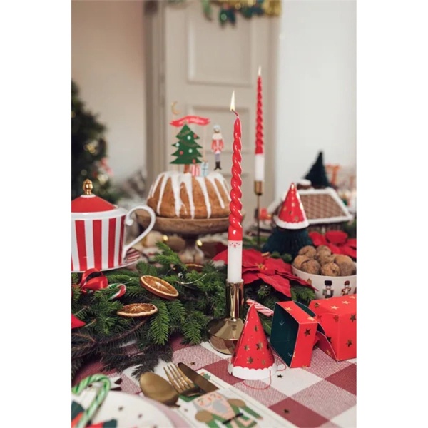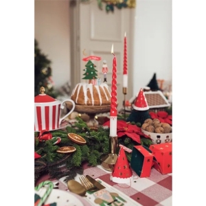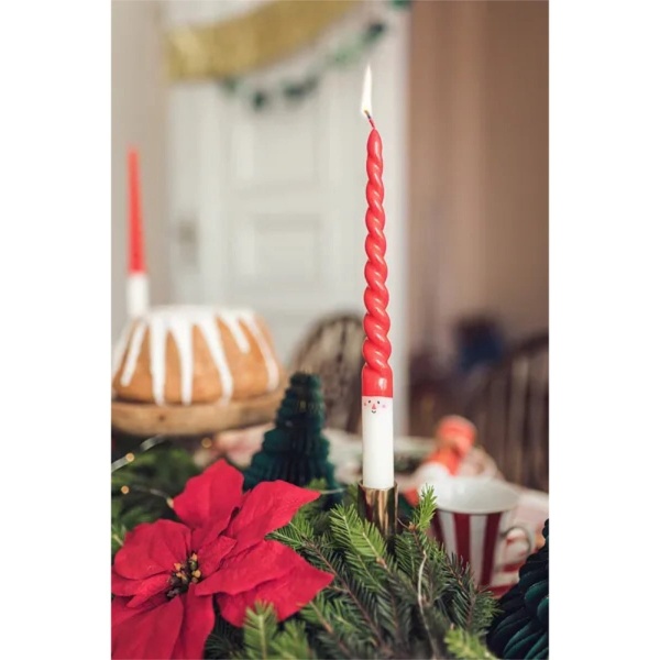 Svíčky mají tvar spirály, což připomíná Santovu čepici. Spodní část svíčky je bílá a má veselý obličej.