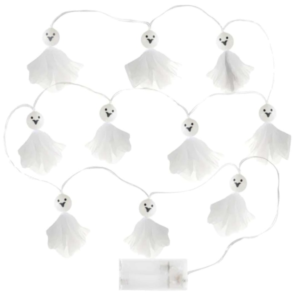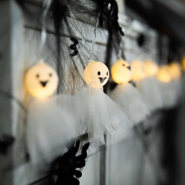 Malí duchové jsou spojeni do série průhledným kabelem jako je u vánočního osvětlení. Řetěz bude stylovým doplňkem na výzdobu halloweenské párty.
