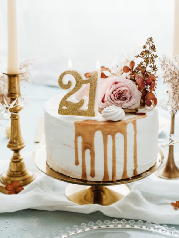 Narozeninová svíčka číslo 21 ve zlaté třpytivé barvě, velikost cca 7,5 cm.