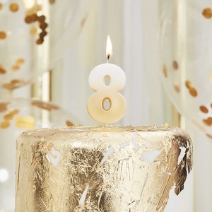 Svíčka číslo 8 ve zlatém a bílém odstínu je velikosti 5 x 4 cm.