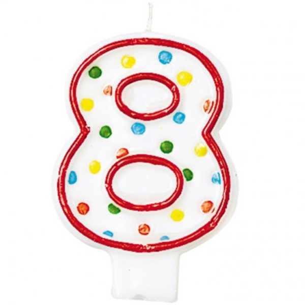 | Krásná svíčka číslo 8 s puntíkatým dekorem se bude dobře vyjímat na každém narozeninovém dortu. Nezapomeňte na tuto … |