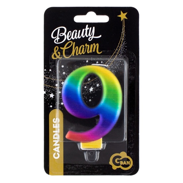 Dortová metalická duhová svíčka ve tvaru číslice 9 vám vytvoří krásnou dekoraci narozeninového dortu pro děti i dospělé.