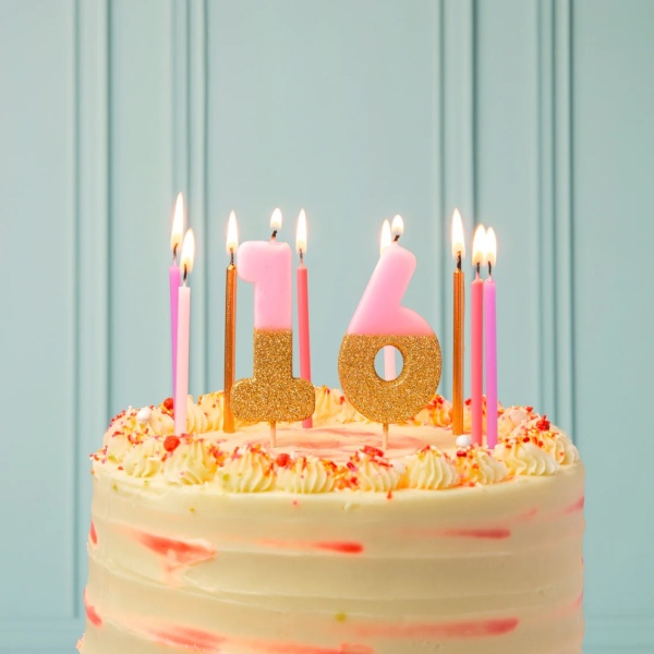 Růžová barva se třpytivými zlatými glitry dodá slavnostnímu dortu eleganci a styl. V její spodní části je svíčka zakončena zápichem pro pohodlné umístění na dort.