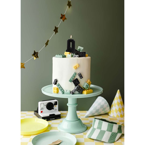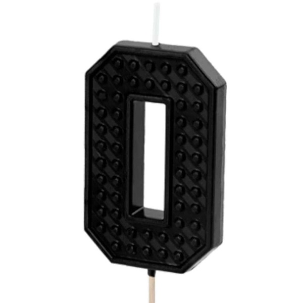 Černá dortová svíčka číslo 0 zdobená jedinečným způsobem, připomínajícím oblíbené LEGO kostky