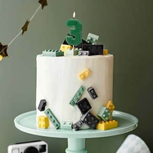 Tmavě zelená dortová svíčka číslo 3 zdobená jedinečným způsobem, připomínajícím oblíbené LEGO kostky