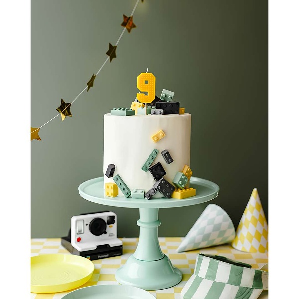 Žlutá dortová svíčka číslo 9 zdobená jedinečným způsobem, připomínajícím oblíbené LEGO kostky