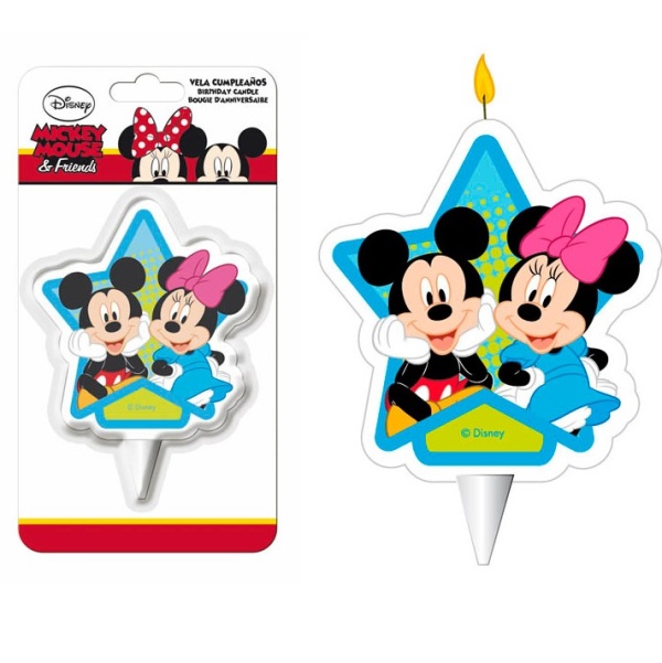 Tato narozeninová 2D dortová svíčka má oficiální licenci Disney. Jsou na ní v modrozelené hvězdě vyobrazeni slavné postavičky Mickey a Minnie Mouse.