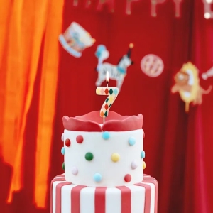Svíčka na dort je s barevnými kosočtverci a ideální na narozeninovou oslavu v tématu Cirkus.