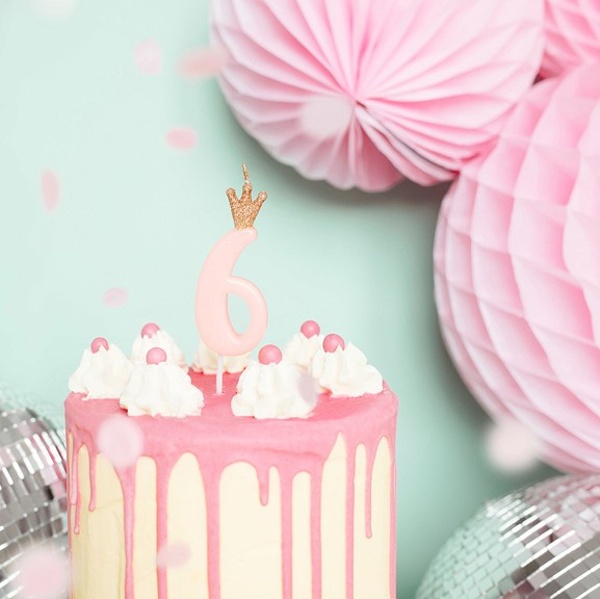 Tato narozeninová svíčka na dort číslo 6 ve světle růžové barvě se zlatou korunkou vám na něm udělá velkou parádu.