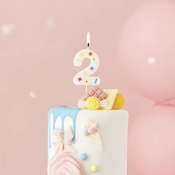 Tuto narozeninovou svíčku zdobí barevné konfetové proužky a hvězdičky v jemných pastelových barvách, které jí dodávají veselý vzhled.