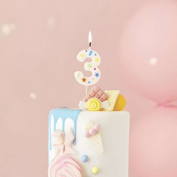 Tuto narozeninovou svíčku zdobí barevné konfetové proužky a hvězdičky v jemných pastelových barvách, které jí dodávají veselý vzhled.
