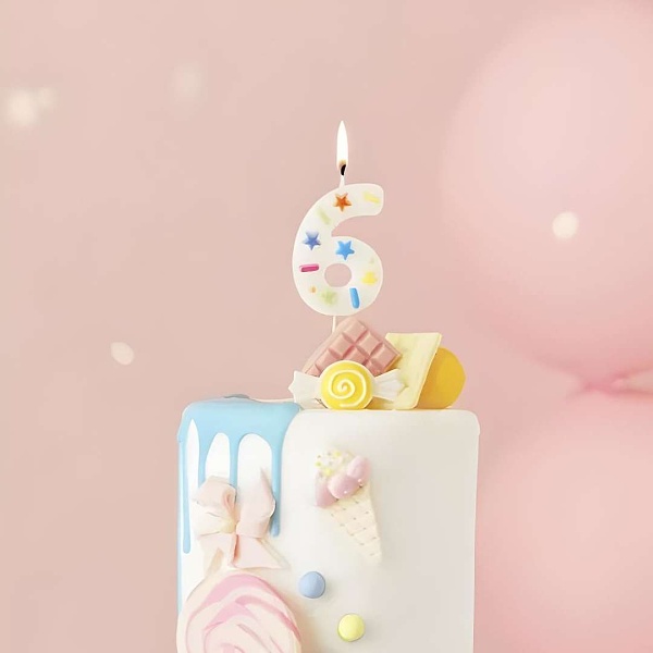 Tuto narozeninovou svíčku zdobí barevné konfetové proužky a hvězdičky v jemných pastelových barvách, které jí dodávají veselý vzhled.
