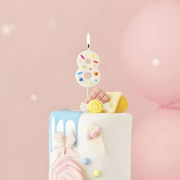 Tuto narozeninovou svíčku zdobí barevné konfetové proužky a hvězdičky v jemných pastelových barvách, které jí dodávají veselý vzhled.