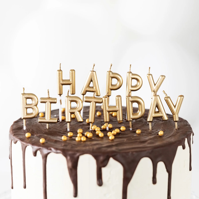 Sada dortových svíček s písmeny, tvořících nápis Happy Birthday ve zlaté barvě.