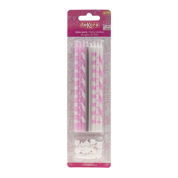 Růžové, bílé a stříbrné svíčky, které jsou ideální pro zdobení narozeninového dortu.
