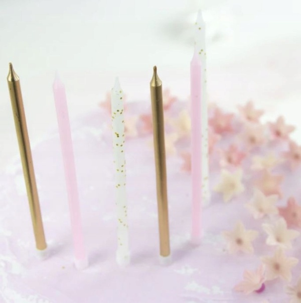 Dortové svíčky jsou v barvě růžové, zlaté a bílé se zlatými tečkami.