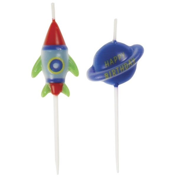 Tyto kosmické svíčky planet a raket jsou vhodné také na drobné dortíky, muffiny, cupcakes.
