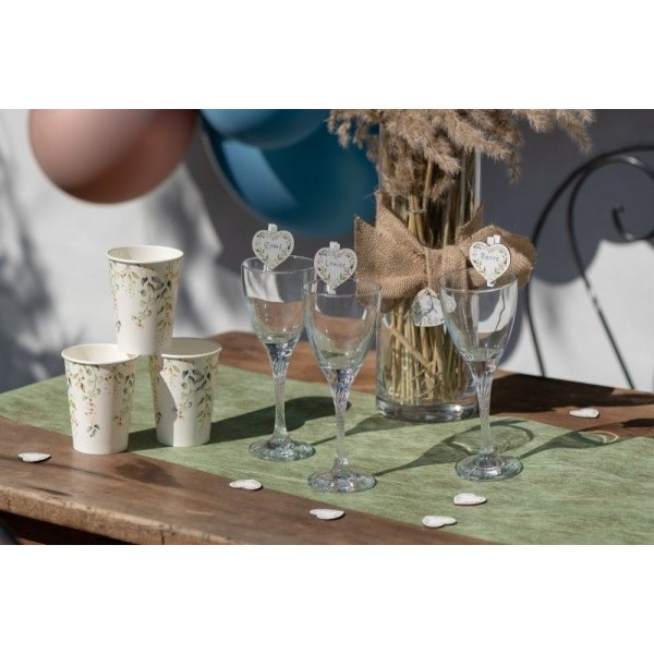 Papírové kelímky Green Wedding s jemným potiskem barevných kvítků a lístků.