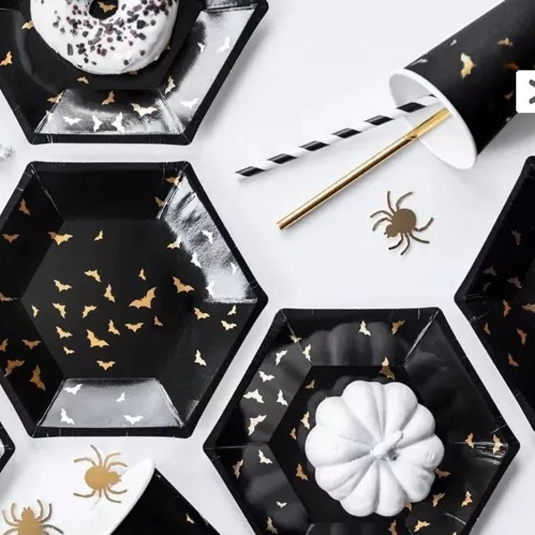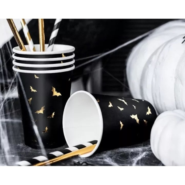 Papírové jednorázové kelímky v černé barvě se zlatým potiskem netopýrů