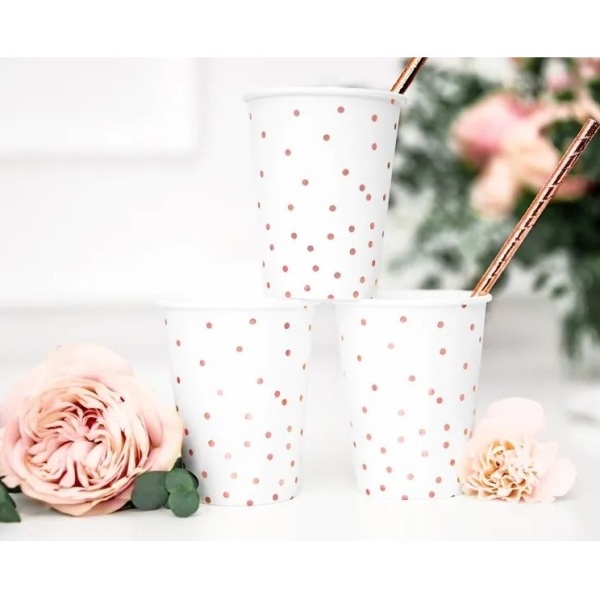 Bílé jednorázové papírové kelímky s tečkovaným vzorem z růžového zlata