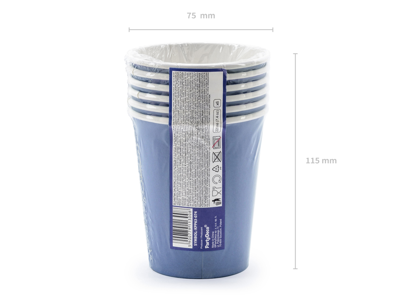 | Papírové kelímky v tmavě modré barvě s holografickým nápisem Happy B'day!, objem až 220 ml. |