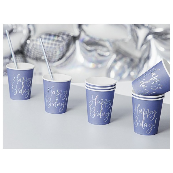 Krásné narozeninové kelímky v modré barvě s holografickým nápisem Happy Birthday.