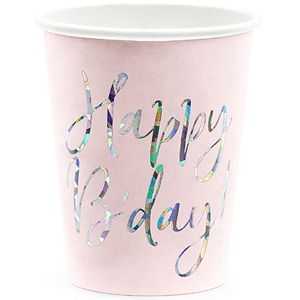 Stylová novinka je skvělý tip pro dámskou narozeninovou oslavu. Papírové kelímky ve světle pudrové růžové barvě s holografickým nápisem Happy B'day ! určitě navodí správnou atmosféru pro přípitek s lahví Prosecca, Kapacita cca 220 ml.