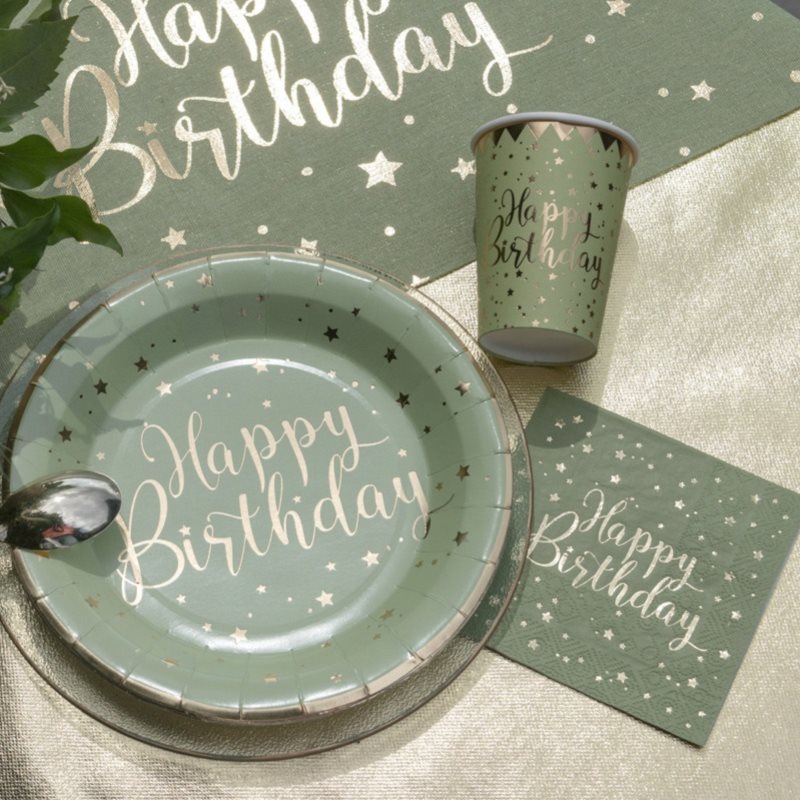 Uspořádejte skvělou narozeninovou oslavu s těmito olivovými designovými kelímky se zlatým nápisem „Happy Birthday“ a hvězdičkami. Svou originální a moderní barvou budou vítány na vaší narozeninové oslavě.