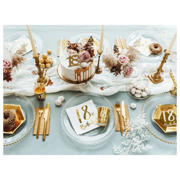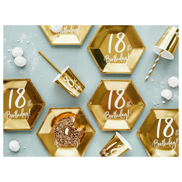 Papírové kelímky ve zlaté lesklé barvě s bílým nápisem k jubilejním 18.narozeninám.