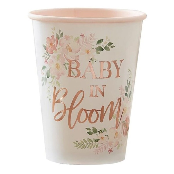 Něžně krásné papírové kelímky s drobnými růžovými kvítky a nápisem Baby in Bloom v barvě růžového zlata jsou