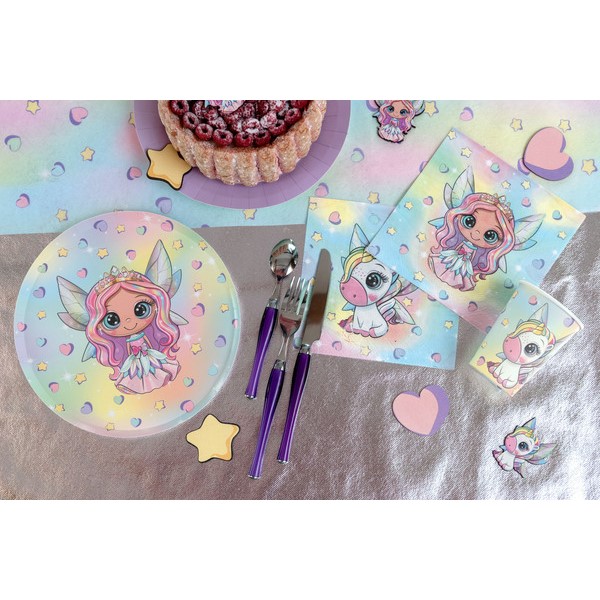 Praktické a jednorázové papírové kelímky Duhová víla v jemných pastelových barvách jsou důležitý doplněk stolní výzdoby pro malé slečny, které si oblíbily kouzelné víly a bájné jednorožce.