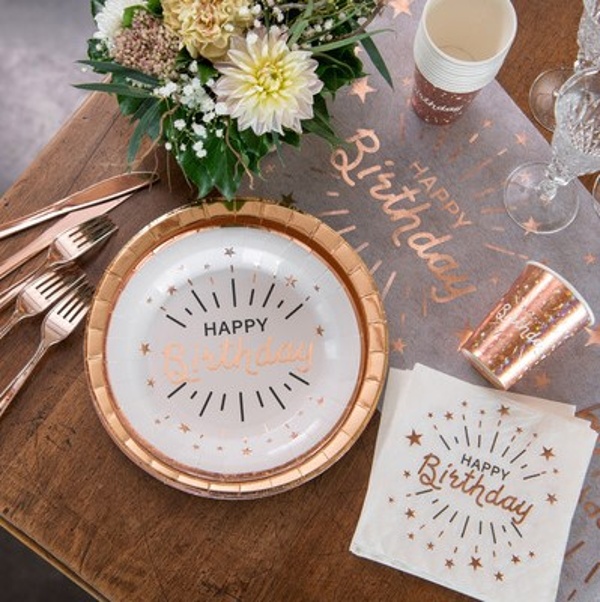 Papírové kelímky v barvě růžového zlata s nápisem Happy Birthday