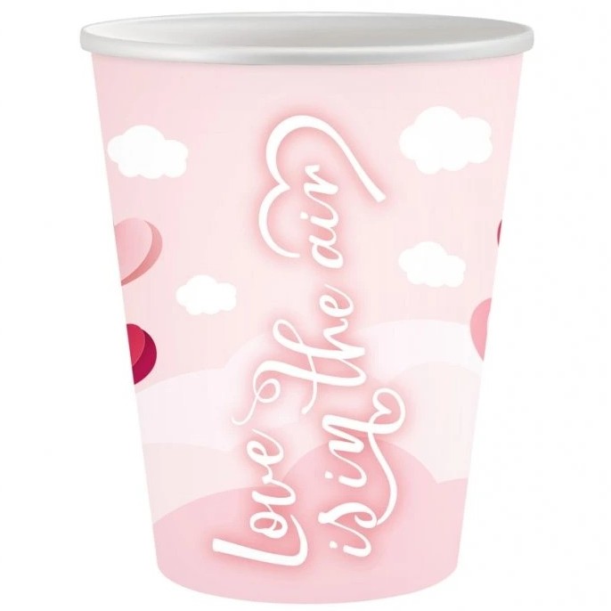 Papírové jednorázové kelímky v růžové barvě s roztomilými srdíčky a nápisem Láska je ve vzduchu se skvěle hodí k oslavě Valentýna, výročí, zásnub, svatby či vyznání lásky.