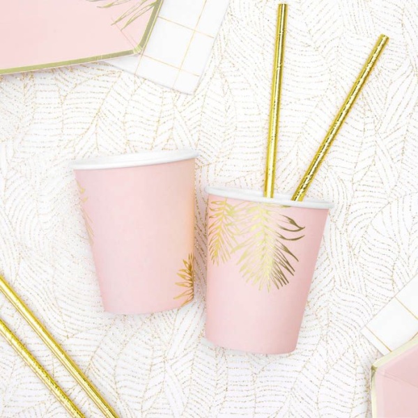 Stylové jednorázové kelímky jsou světle růžové a jsou zdobeny listy ve zlaté fólii.