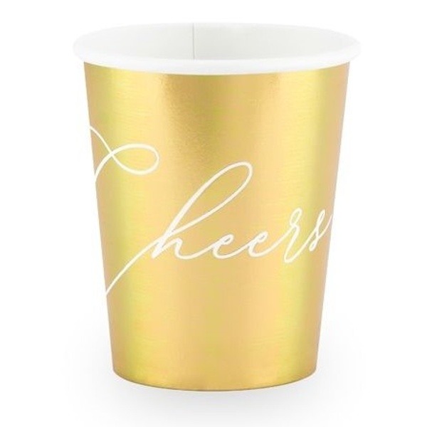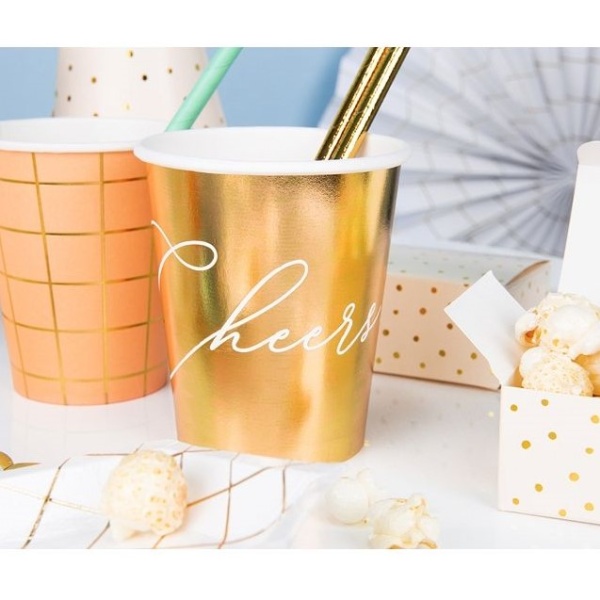 Papírové kelímky zlaté s bílým nápisem "Cheers" jsou nezbytným doplňkem každé narozeninové oslavy, párty nebo oslav příchodu Nového roku.