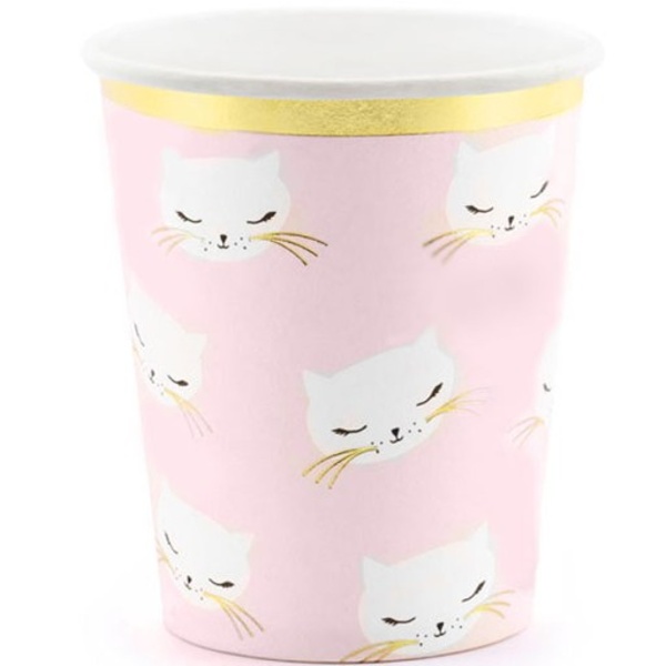 Papírové jednorázové kelímky v růžové barvě s kočičí hlavou a zlatým okrajem jsou vhodné pro teplé i studené nápoje.