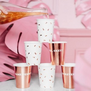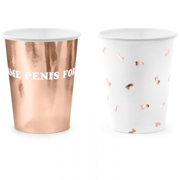polovina sady je celá ze zrcadlově růžovo-zlatých kelímků s bílým nápisem Same Penis Forever.