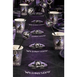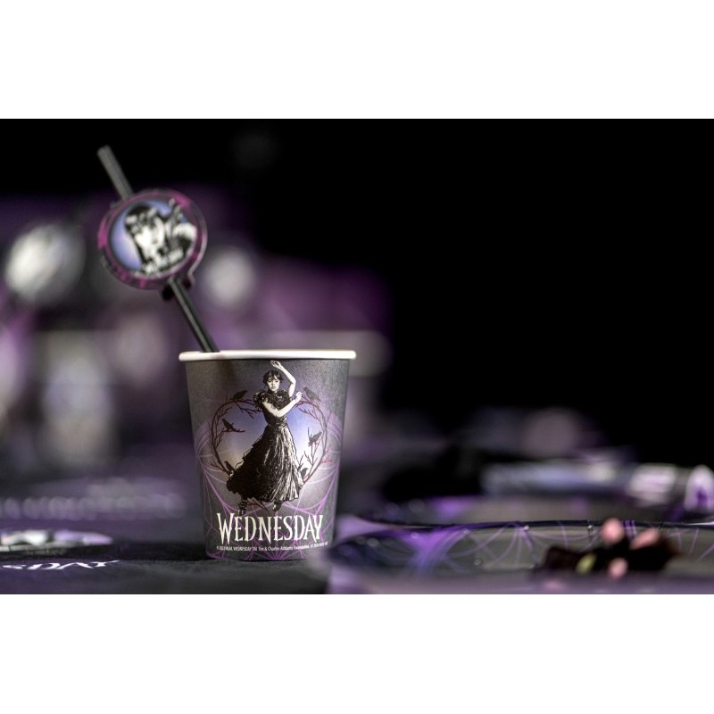 Dodejte svému tématickému večírku zvláštní nádech a doplňte stolování těmito papírovými kelímky s potiskem Wednesday Adams v černých, šedých a fialových tónech.