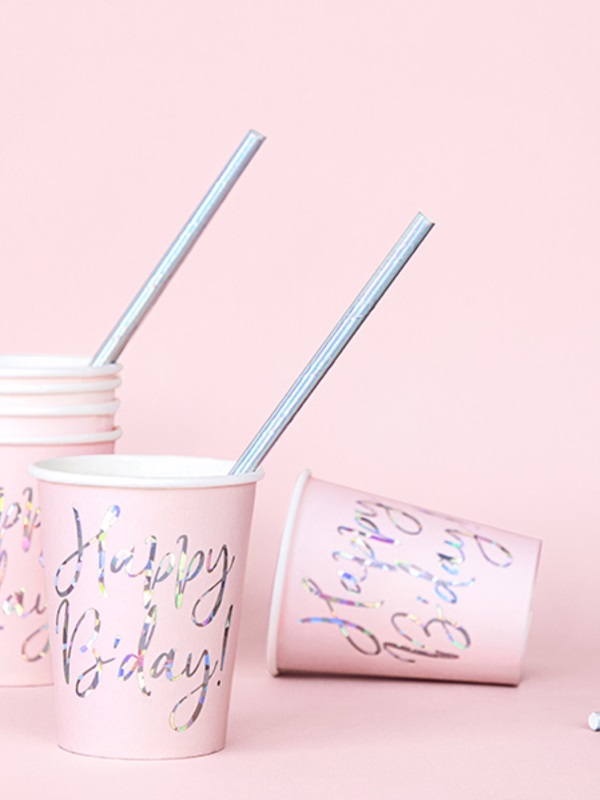 Papírové talíře v pudrově růžové barvě s duhovým nápisem Happy B'day! jsou novinkou ze stylové řady Happy Birthday Prosecco.