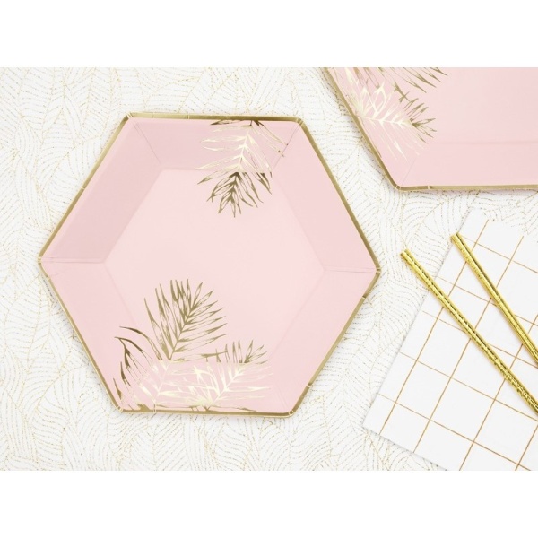 Jednorázové papírové světle růžové talíře se zlatým okrajem a potiskem palmových listů.