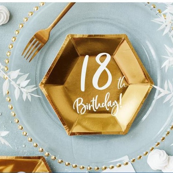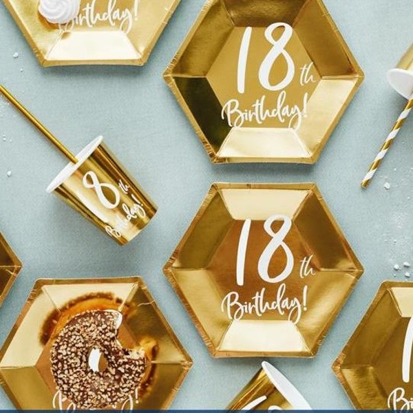 | Papírové talíře barevné ve zlatém lesklém provedení s bílým nápisem k jubilejním 18. narozeninám. Rozměry 20 x 17 … |