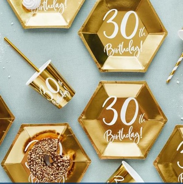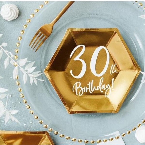 | Papírové talíře barevné ve zlatém lesklém provedení s bílým nápisem k jubilejním 30. narozeninám. Rozměry 20 x 17 … |