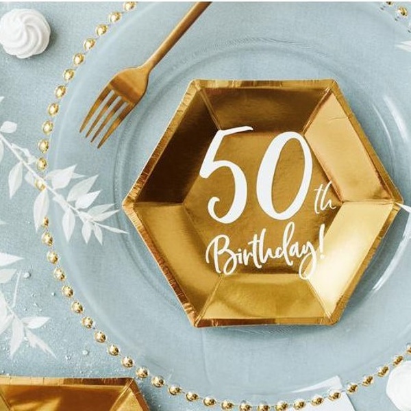 | Papírové talíře barevné ve zlatém lesklém provedení s bílým nápisem k jubilejním 50. narozeninám. Rozměry 20 x 17 … |