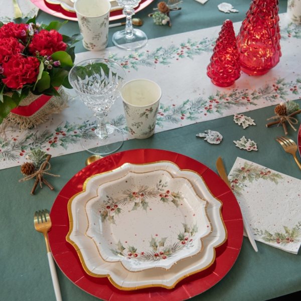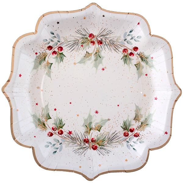 Elegantní papírové talíře s vroubkovanám okrajem a s větvičkami cesmíny jsou ideální volbou pro vánoční stůl, zimní setkání s rodinou, firemní večírky nebo vánoční párty.