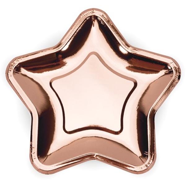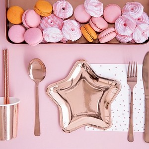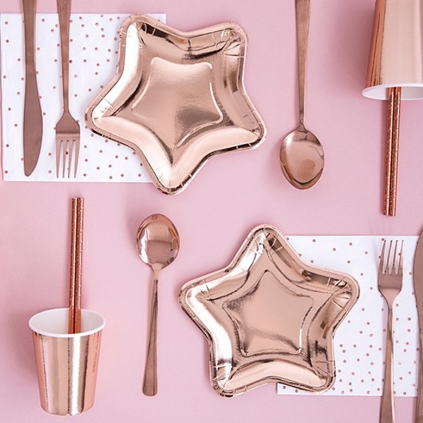 Talířky papírové metalické ve tvaru hvězdy v barvě růžového zlata.