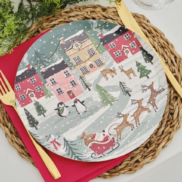 Vytvořte kouzelnou vánoční atmosféru s těmito papírovými talířky Vánoční vesničky.