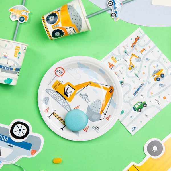 Sada nádherných papírových talířků na slané i sladké občerstvení s motivem pro tématickou párty Stavební práce.