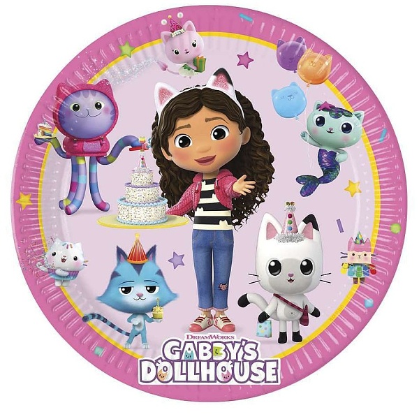 pro malé slečny. Na každém talíři je Gabby, milá hostitelka Gabbyina domečku pro panenky, spolu s jejími rozkošnými kočičími kamarády.